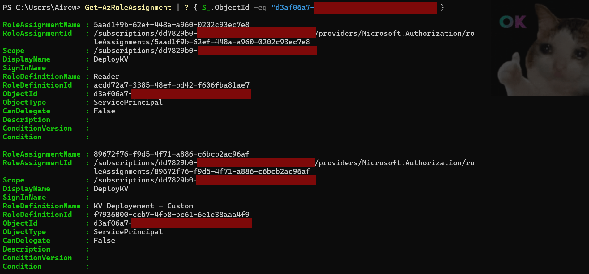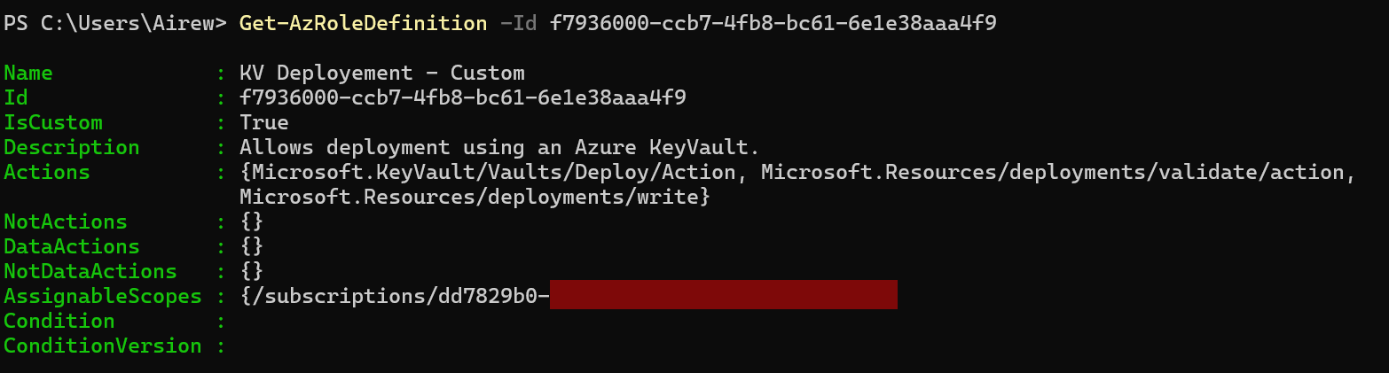 (New-AzResourceGroupDeployment -Name "Deployment_KV_FW_Bypass" -ResourceGroupName "rg_sara" -TemplateFile .\deployment_template.json -TemplateParameterFile .\deployment_param.json).Outputs | fl