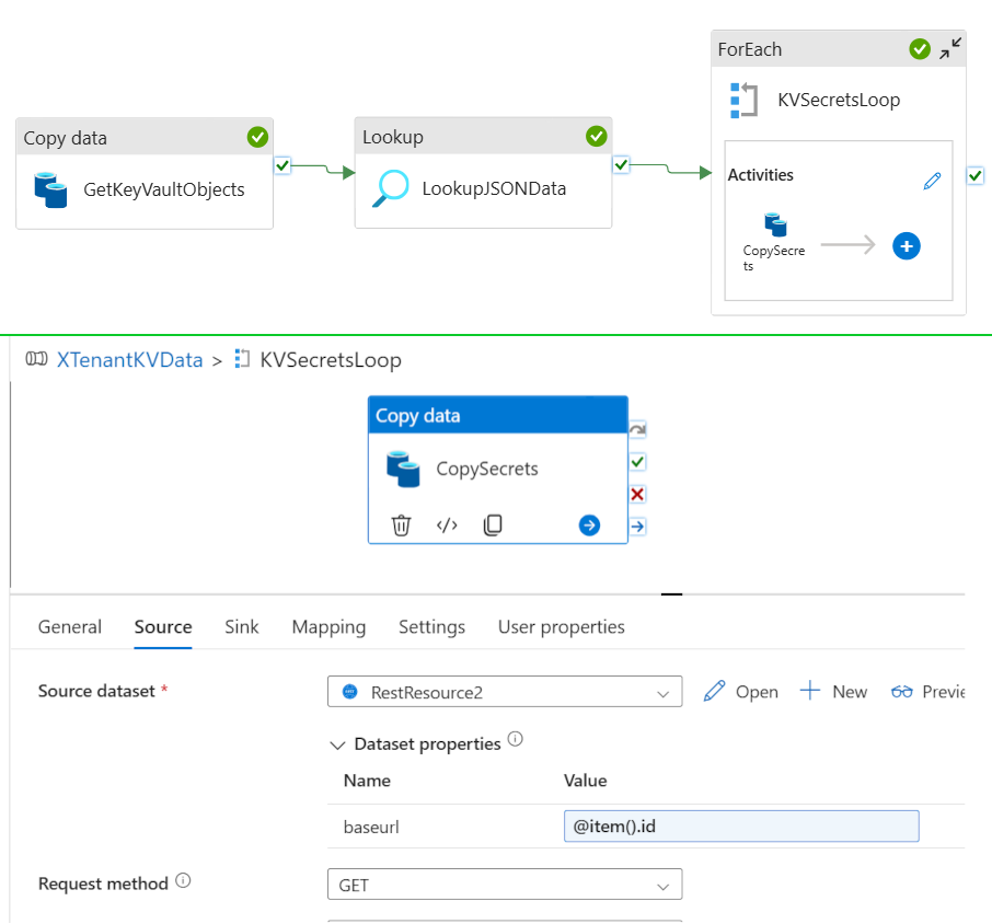 - After digesting some Data Factory documentation, I set up a simple pipeline to retrieve all secret objects in the Key Vault, loop through each object, call the Key Vault data plane to get the secret value, and write the results to a storage account.