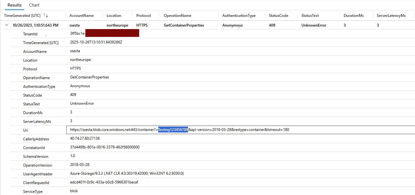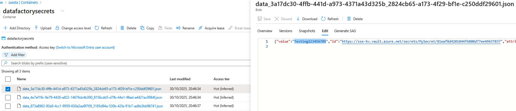 ✅ Result — The call initiated from Data Factory was visible in the storage account logs with the secret value visible.
