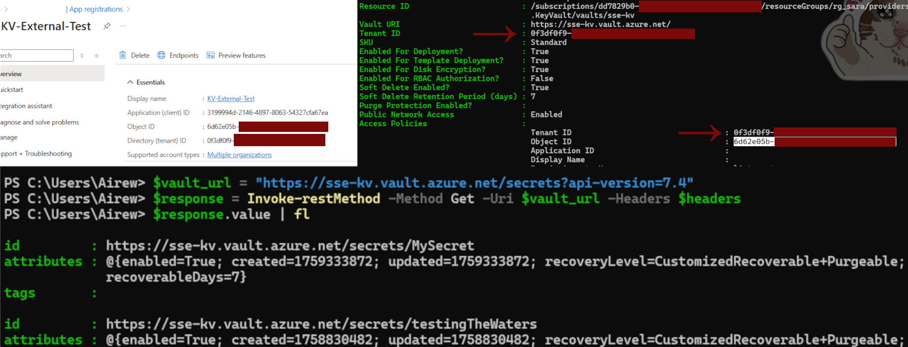tenantIdand an access policy for an external tenant, combined with “Allow trusted Microsoft services to bypass this firewall,” allowed cross-tenant access from ADF compute to retrieve secrets.