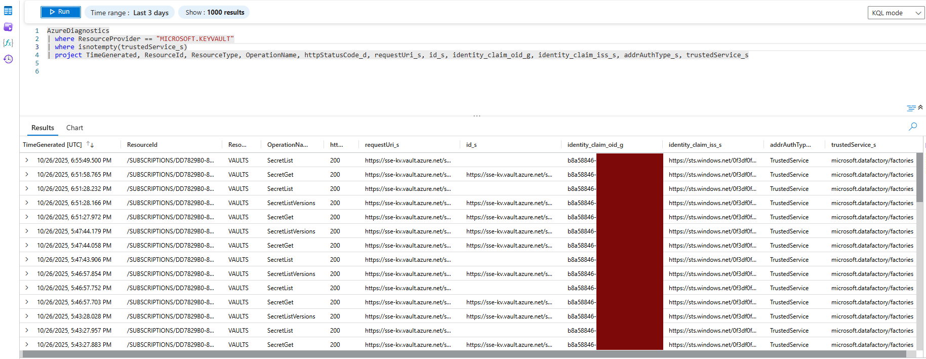 | project TimeGenerated, ResourceId, ResourceType, OperationName, httpStatusCode_d, requestUri_s, id_s, identity_claim_oid_g, identity_claim_iss_s, addrAuthType_s, trustedService_s