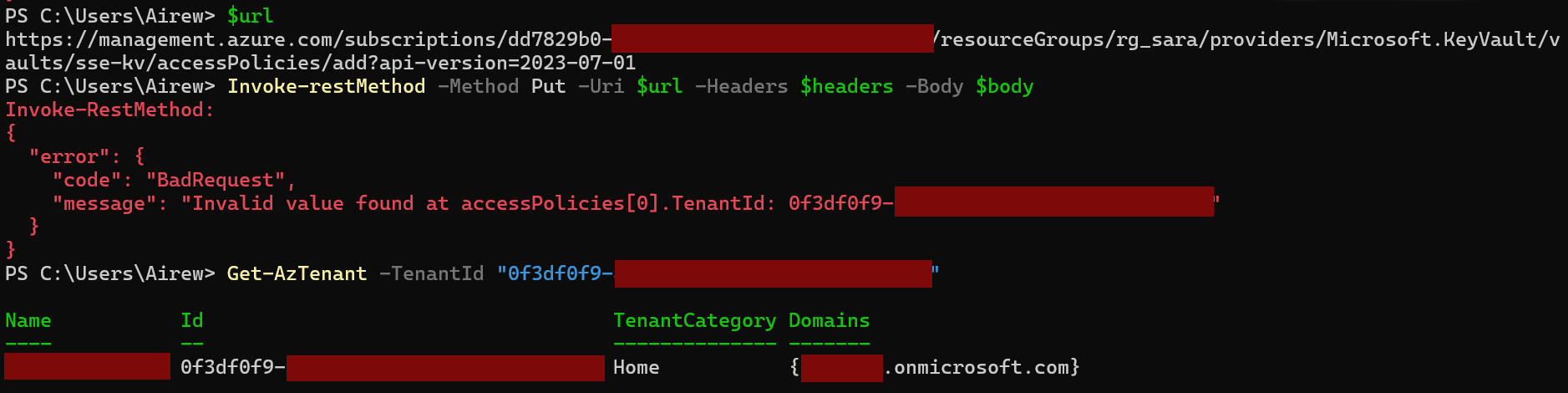 Examining the JSON structure of a Key Vault, two tenant-related properties stand out: the Key Vault resource tenantId and the tenant value inside each access policy. According to Microsoft documentation, both values must match for an access policy to be accepted, which explains the previous error: