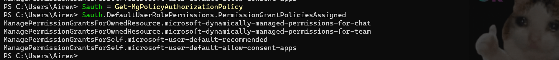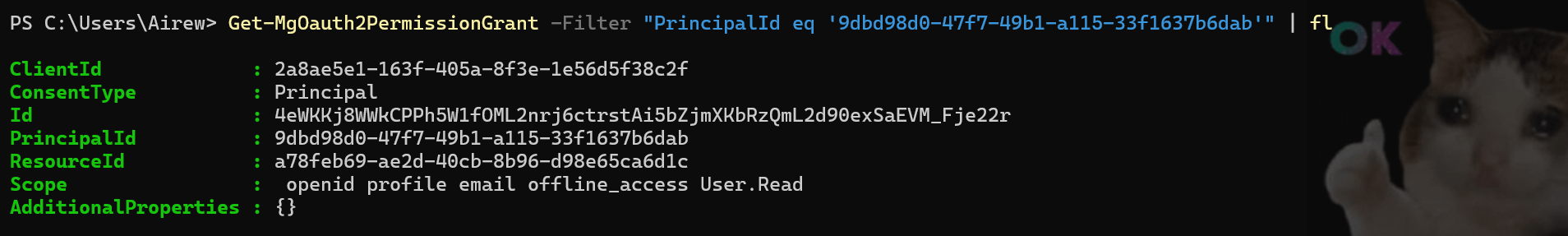 Permissions that only require the user’s consent are listed with the AdminConsentRequired set to ‘No’ with, on the default Entra ID configuration, the exclusion of some permissions through a consent policy managed by Microsoft. Microsoft documentation does not always enumerate all permissions included or excluded under these policies. Full visibility therefore requires exploring the PermissionGrantPolicies object via CLI.