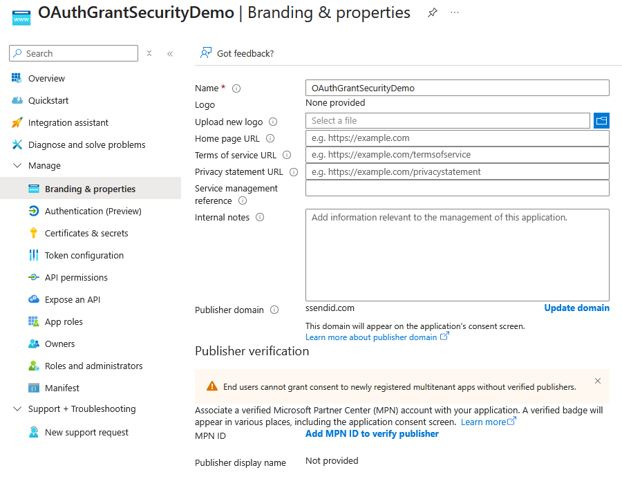 ⚠️ Attention: A warning indicates that end users cannot grant consent to newly registered multi-tenant applications unless the publisher is first verified, a restriction enforced by default since 2020.