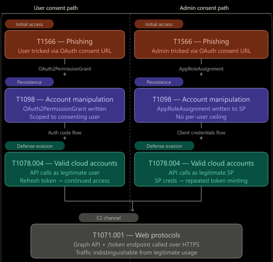 Two primary attack paths implement this model: delegated permissions (user consent) and application permissions (admin consent). Both ultimately result in the issuance of OAuth tokens that can be used to interact with tenant resources, either in a user context or application context.